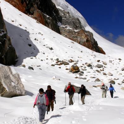 We start our trekking early in the morning as we have to climb high Kongma La Pass. We continue a moderate level of trekking until Pokalden base camp. We take an elevated route through a narrow path to reach the summit of Kongma La Pass. After about 5-6 hours of trekking we reach the summit which offers the magnificent view of Himalayas and peaks. We descend downwards from the pass and arrive at Khumbu glacier. We trek further towards Lobuche and stay overnight at a tea house.